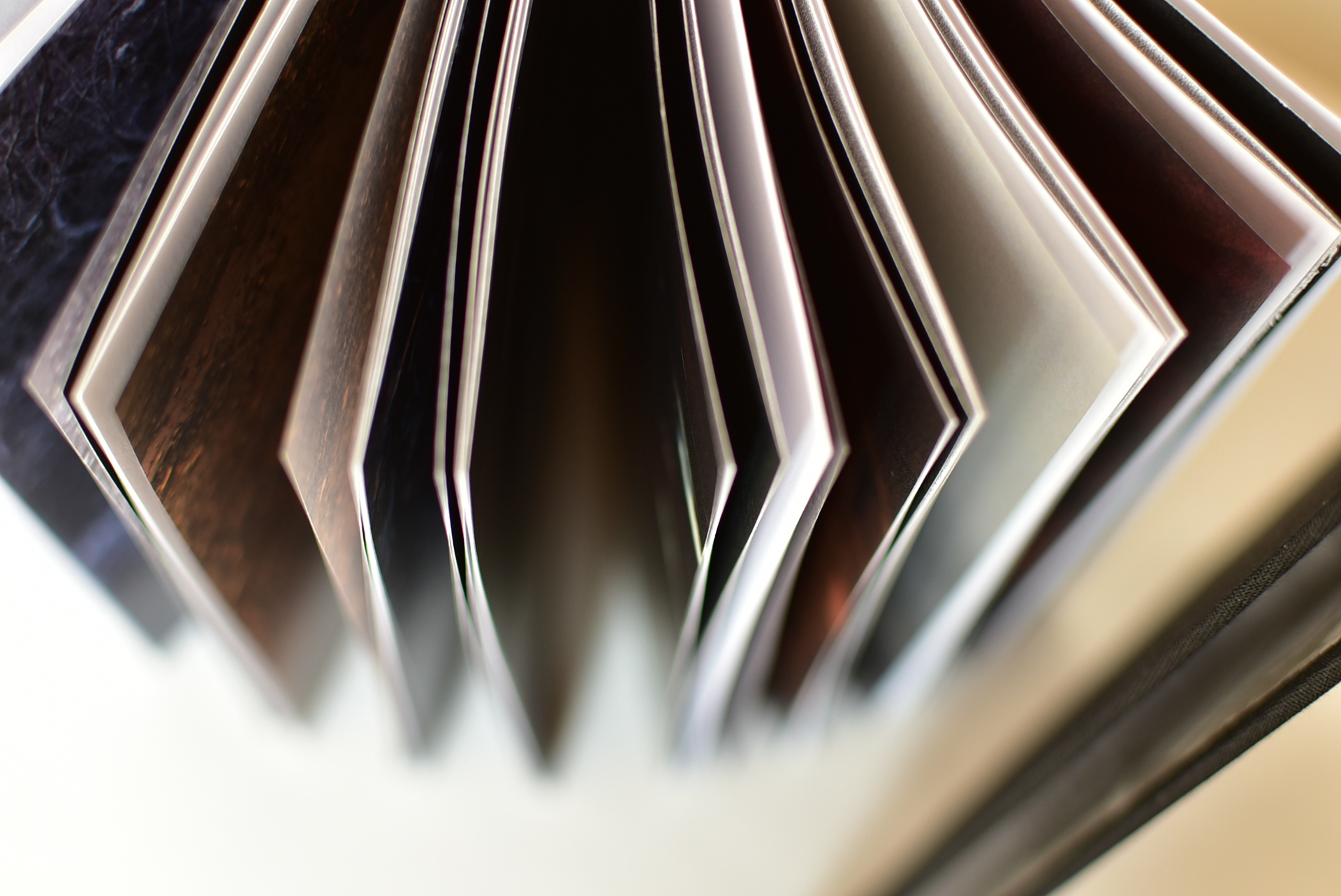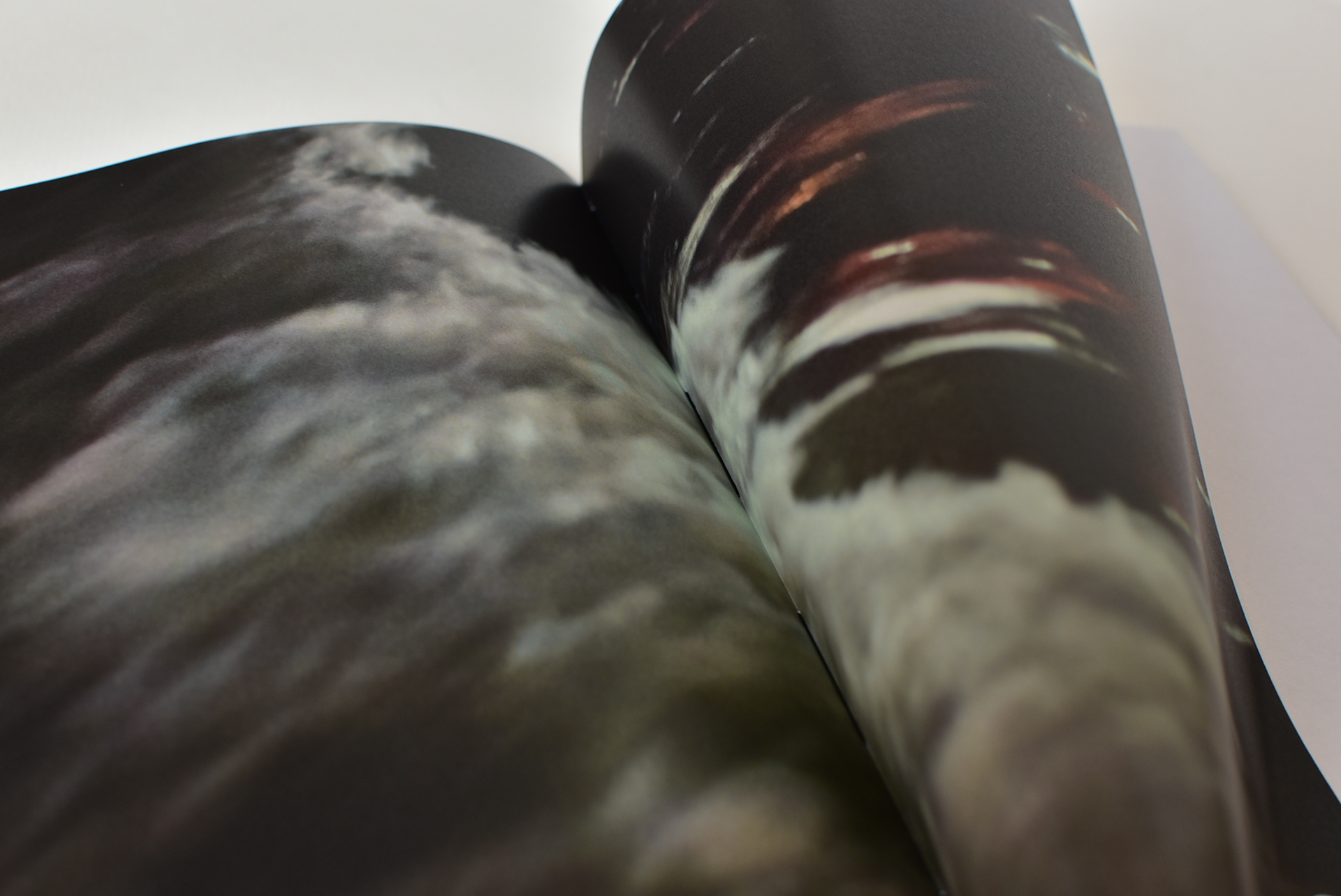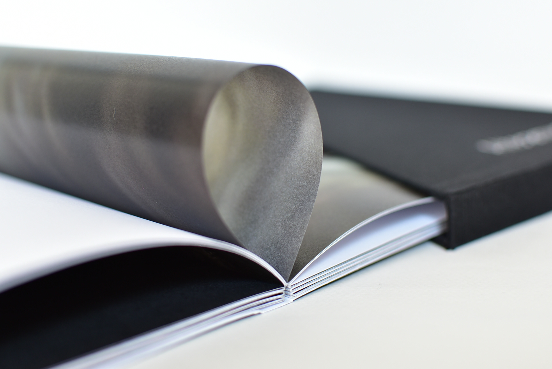 Tale idea è stata risolta con la ricorrenza di pagine bianche, nere e semitrasparenti. Le mani e gli occhi del lettore si trovano contemporaneamente in relazione con la ruvidezza della carta, il nero inchiostro dei fondi e l'opacità delle pagine centrali nelle sequenze.