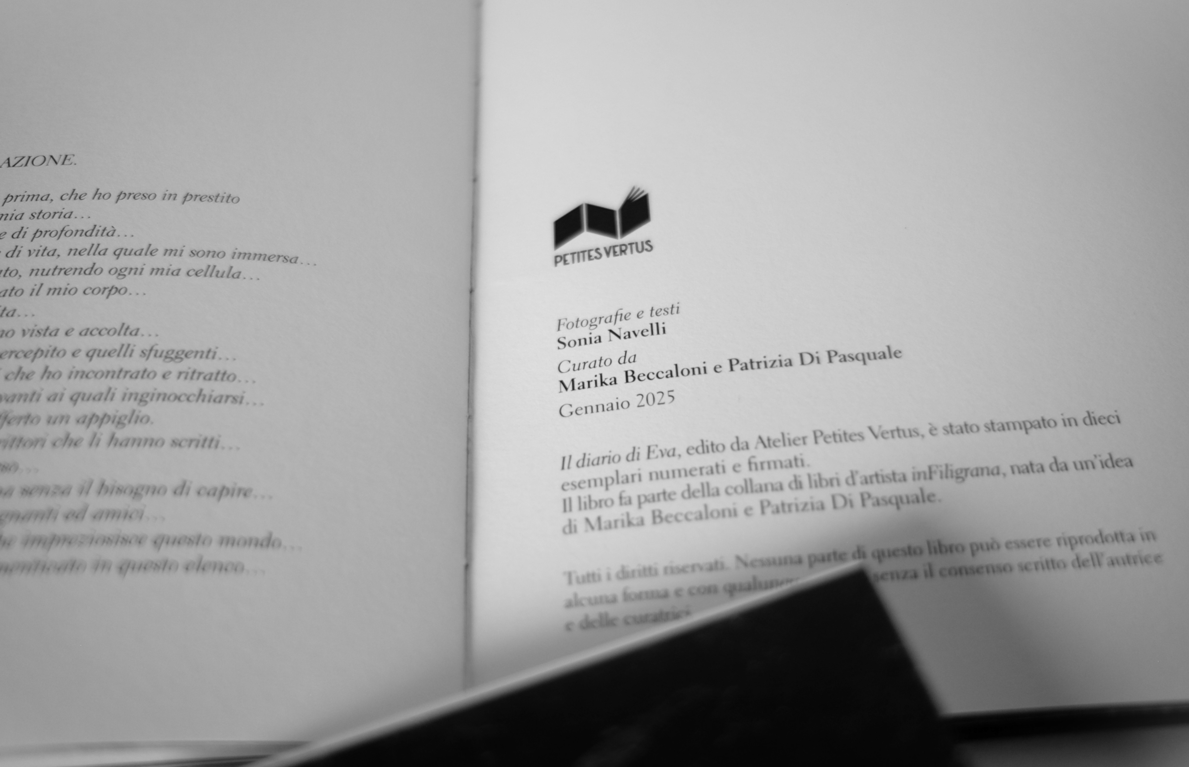 Dettagli: Diario di Eva è un libro fotografico d'artista, numero due appartenente alla collana infiligrana, ideata e curata in ogni sua parte da Marika Beccaloni e Patrizia Di Pasquale. Diario di Eva è stato stampato e prodotto in dieci copie di proprietà dell’autrice.
