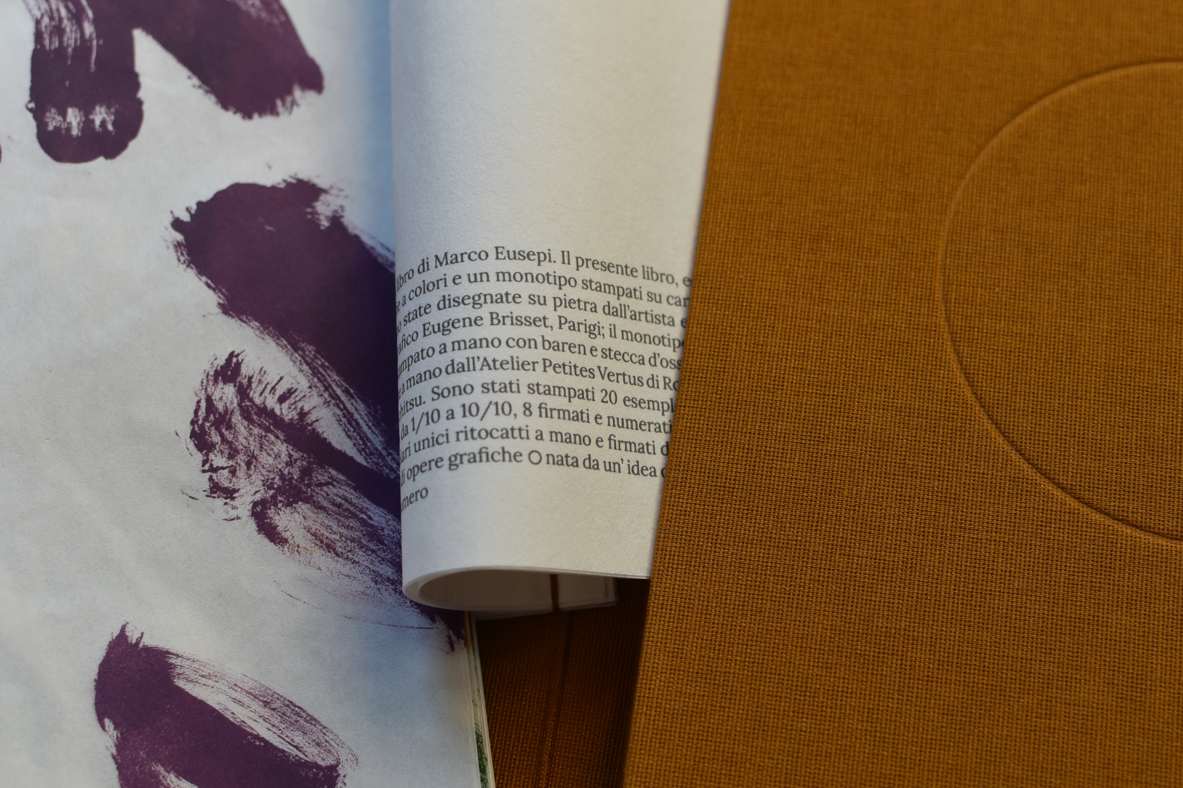 Dettagli: Il libro, edito in 20 esemplari numerati e firmati dall'artista, fa parte della collana opere grafiche O. I volumi contengono litografie a colori e un monotipo stampati su carta giapponese Tosa-washi da 28 g. La rilegatura del libro (yotsume toji) e la costruzione del cofanetto (shiho chitsu) sono state eseguite per la Litografia Bulla dall'Atelier Petites Vertus, rispettando i canoni della tecnica tradizionale giapponese. Il libro è stato cucito con filato di cotone francese, le copertine e i fogli di guardia sono in washi da 80 g. Il cofanetto è rivestito in tela; completa il design del cofanetto l'impressione a secco.