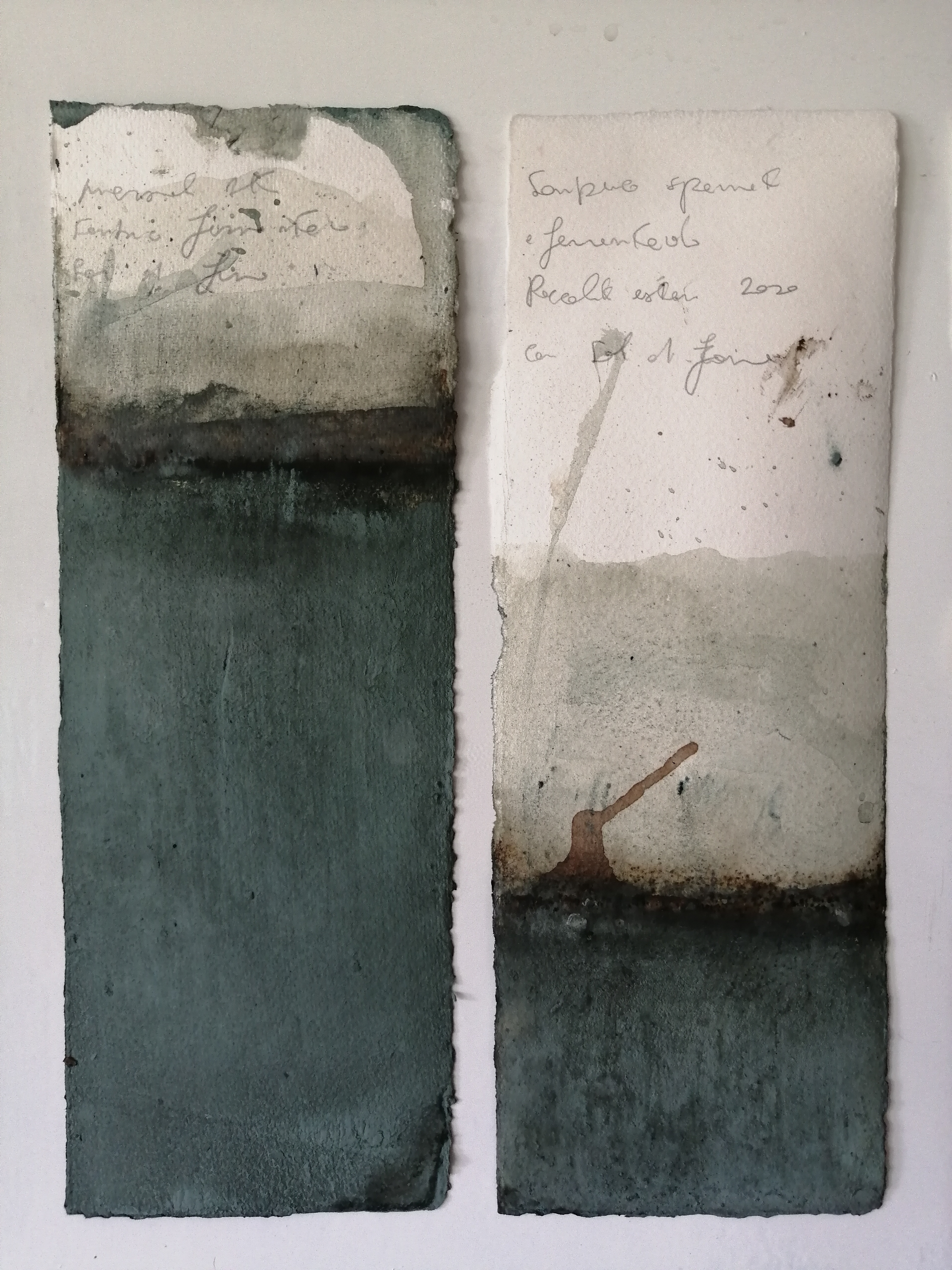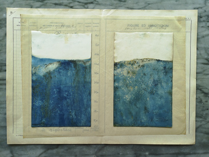 Il tentativo di rendere eterna l’opera o estendere la durata degli esiti del processo transitorio dell’agire artistico è un concetto davvero dirimente nell’opera di Ajossa. Risulta chiaro che per l’artista oltrepassare la finitezza come componente irrinunciabile delle opere e delle performance di Land Art equivalga, in parte, a sottrarre l’opera stessa ai criteri di ragionamento e valutazione estetica che il fenomeno Land induce ad utilizzare. Trovo pertanto utilissimo ai fini della nostra veloce lettura intorno all’opera di Riccardo, mettere in continuità questa osservazione con la produzione dei suoi libri d’artista; i libri sono immaginati sia come archivi cartacei per la catalogazione della parte scientifica del lavoro sia come pagine singole che hanno registrato sfumature emotive, fornendo all’artista lo sviluppo lento di un archivio privato connesso, almeno in un caso, ad un evento specifico di vita privata. Dall’osservazione delle pagine dei libri d’artista di Riccardo Ajossa emerge una tratto unico e fondamentale: archiviare, sovrapporre i campioni di colore, accostare i frammenti di carte prodotte per facilitarne lo studio o l’inserimento negli strati del foglio di piccoli oggetti recuperati da un contesto caro all’artista, carica queste opere del ruolo primigenio che il libro possiede: il libro mantiene il suo ruolo ambizioso di testimone, destinato a conservare in perpetuo una volontà che si è tradotta da memoria personale a memoria condivisa nel momento in cui ha scelto la pagina per conservarsi (fig.6 e 7). I libri d’artista di Riccardo mi hanno ricordato le pagine dei diari e dei taccuini romani di Francesca Woodman, artista che ammiro e la cui opera si manifesta mutevole e dunque sfuggente ad ogni rinnovata lettura. Anche Riccardo come Woodman cerca pagine già scritte da altri, pagine che hanno già assorbito dell’inchiostro, pagine che trattengono informazioni lontane. Logori registri scolastici, quaderni ingialliti dal tempo o registri contabili mangiati dall’umidità divengono superfici rinnovate per l’archiviazione di nuovi dati di studio e ricerca; per l’autore quei registri mantengono il fascino di libri lontani dei quali rinnova funzione e significato in un altro contesto. Quaderni di colore naturale, Prove di colore, Carnet de voyage, Studio di colori naturali: sono questi i titoli che l’artista sceglie per classificare i libri d’artista compilati e assemblati ai fini della ricerca, titoli che attingono ad un lessico scientifico, che richiama la metodica del lavoro ancora nella sua fase sperimentale ed evolutiva. Così si definiscono gli spazi espressivi di Riccardo Ajossa, spazi aventi i limiti della pagina come confini entro i quali inserire con equilibrio “appunti, studi, considerazioni e viaggi”.