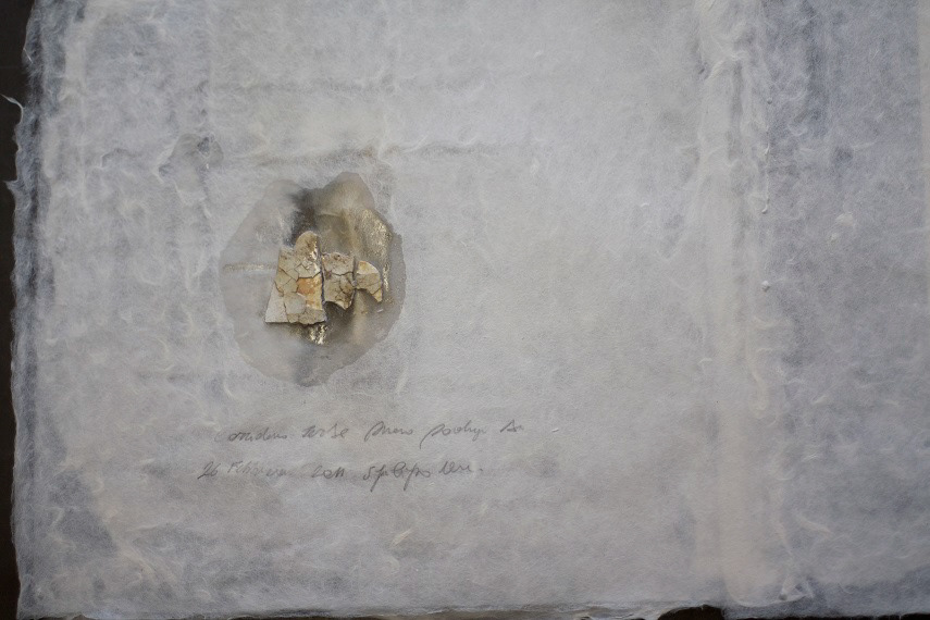 Riccardo mi racconta poi di un altro libro d’artista da lui realizzato giorno dopo giorno, seguendo il flusso di un evento che ha turbato la sua dimensione privata e che lo ha costretto a percepire il passaggio del tempo in modo diverso, “quasi rassegnato”, mi dice. Il libro si intitola Il libro del silenzio (fig.8), le sue pagine, di grandi dimensioni (30x40 cm), sono sciolte come libere da vincoli. A questa libertà di forma del volume corrisponde la costrizione di un oggetto, scelto come soggetto della pagina, e presentato come parte di essa perché integrato nelle fibre stesse della carta e isolato nel bianco della superfice. Gli oggetti sono ben riconoscibili, ma appaiono comunque velati, come spesso i ricordi fragili o che manipoliamo perché ci colgono in momenti di precarietà emotiva. “Questo libro mi ha concesso di registrare il tempo di un fenomeno” afferma Riccardo e prosegue dicendo “ho cercato di farmi amico il tempo, registrandolo attraverso la raccolta di piccoli oggetti trovati intorno a me”; nell’impresa artistica torna nuovamente il tema della registrazione, della catalogazione, dello schedare un fenomeno o un luogo, e con essi le sensazioni dell’artista che vi agisce all’interno. Anche in questo caso i libri d’artista di Riccardo Ajossa non sono esclusivamente opere d’arte, ma si presentano per il ruolo concreto che i libri di tradizione hanno: essere testimoni.